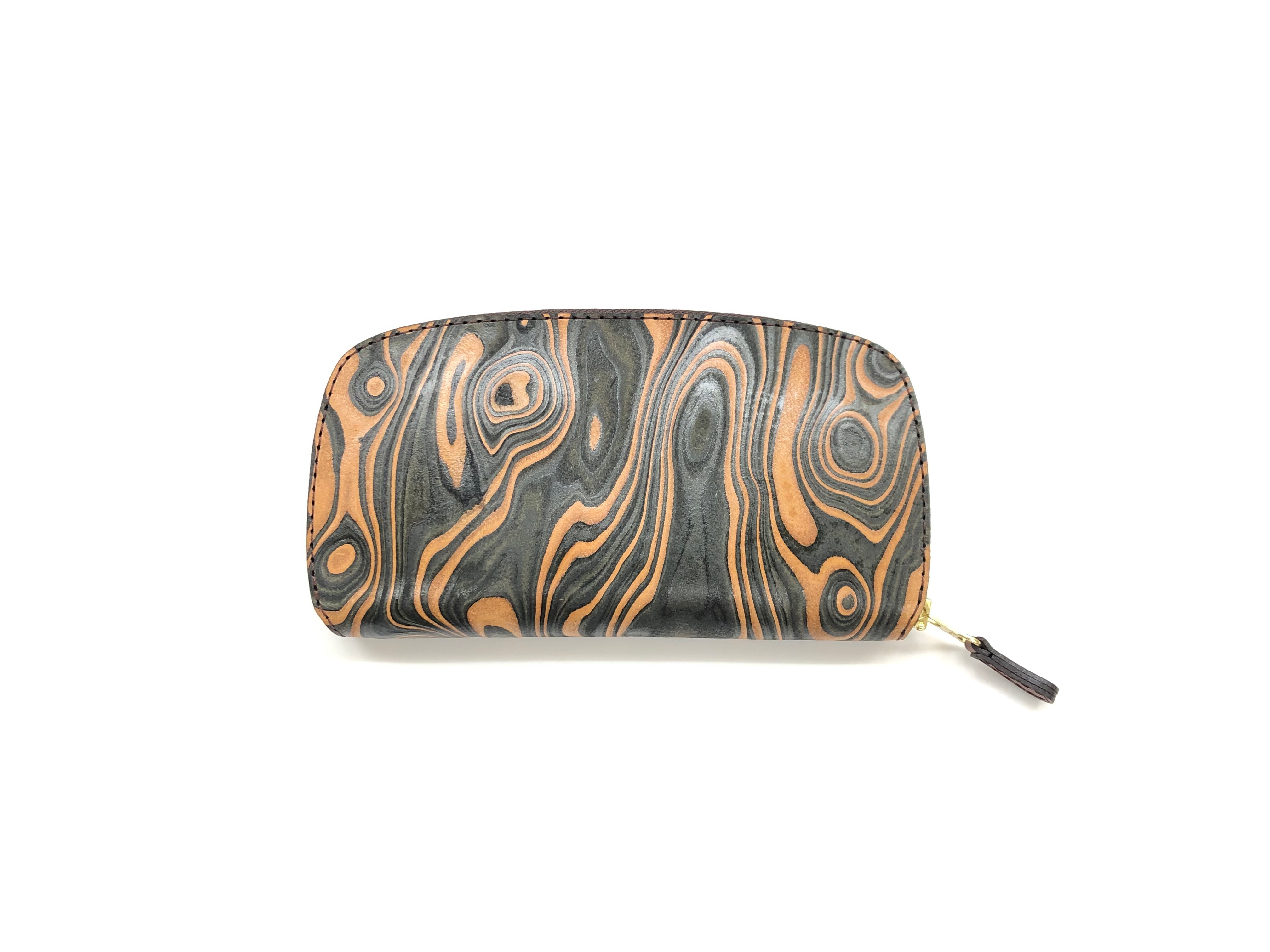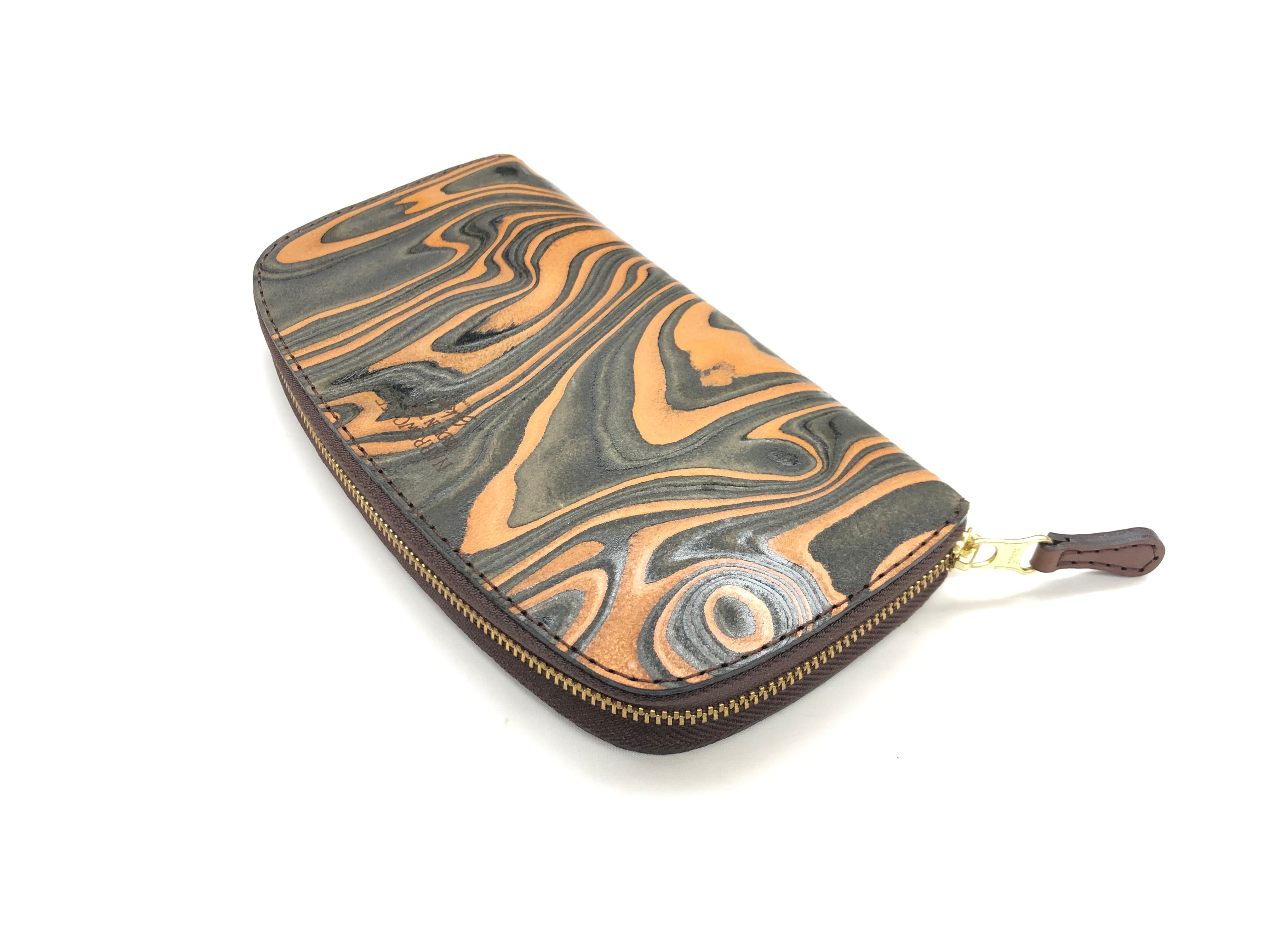 大久保氏が手掛ける、革を染色し、模様が出るように特殊な型押しをした何重枚何百枚の革を重ねて、漉き上げ木目やサイケデリックな模様作り出す、世界に1つのスペシャルなレザーになります。