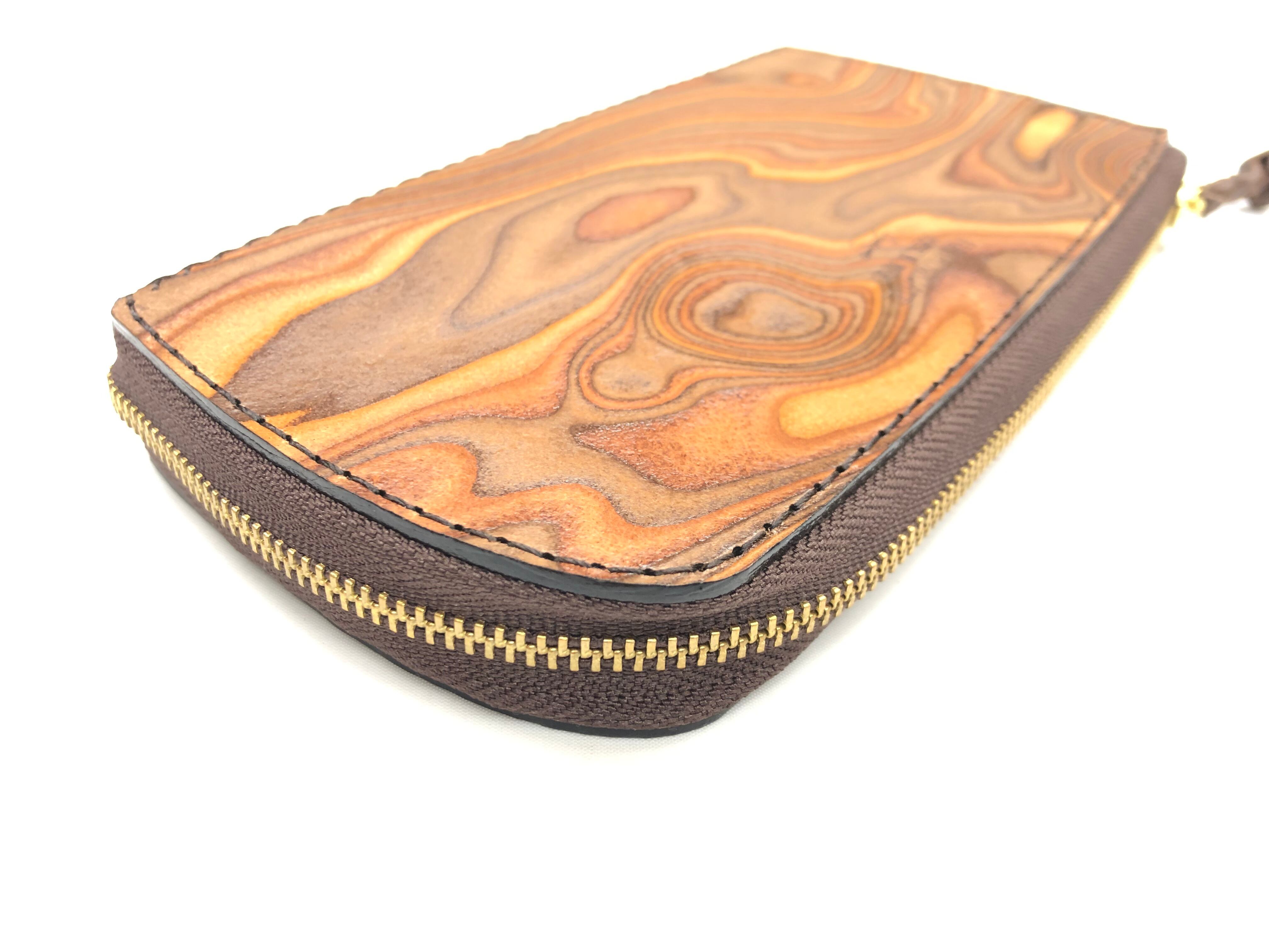 大久保氏が手掛ける、革を染色し、模様が出るように特殊な型押しをした何重枚何百枚の革を重ねて、漉き上げた断面で木目やサイケデリックな模様作り出す、世界に1つのスペシャルなレザーになります。