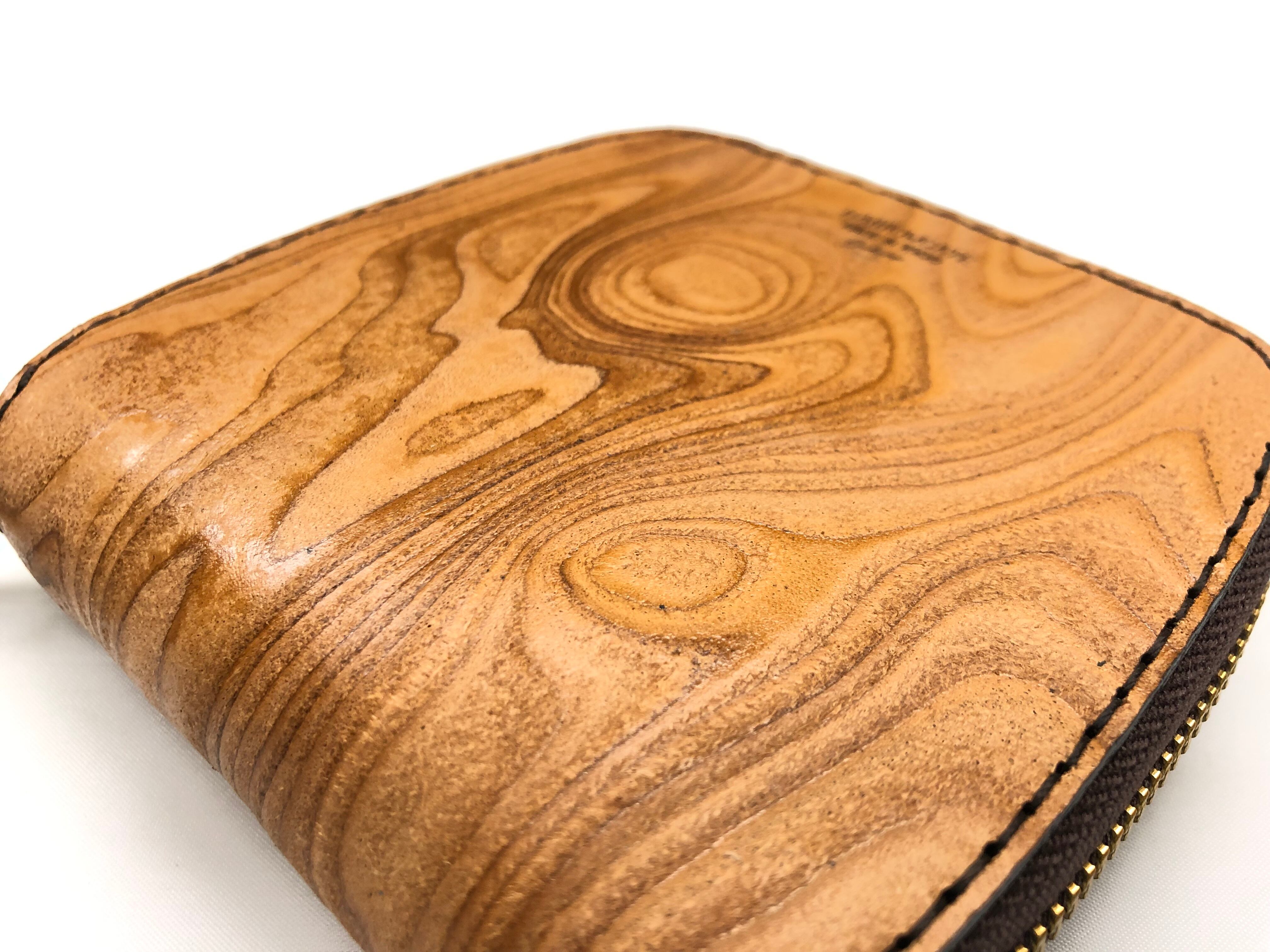 大久保氏が手掛ける、革を染色し、模様が出るように特殊な型押しをした何重枚何百枚の革を重ねて、漉き上げ木目やサイケデリックな模様作り出す、世界に1つのスペシャルなレザーになります。