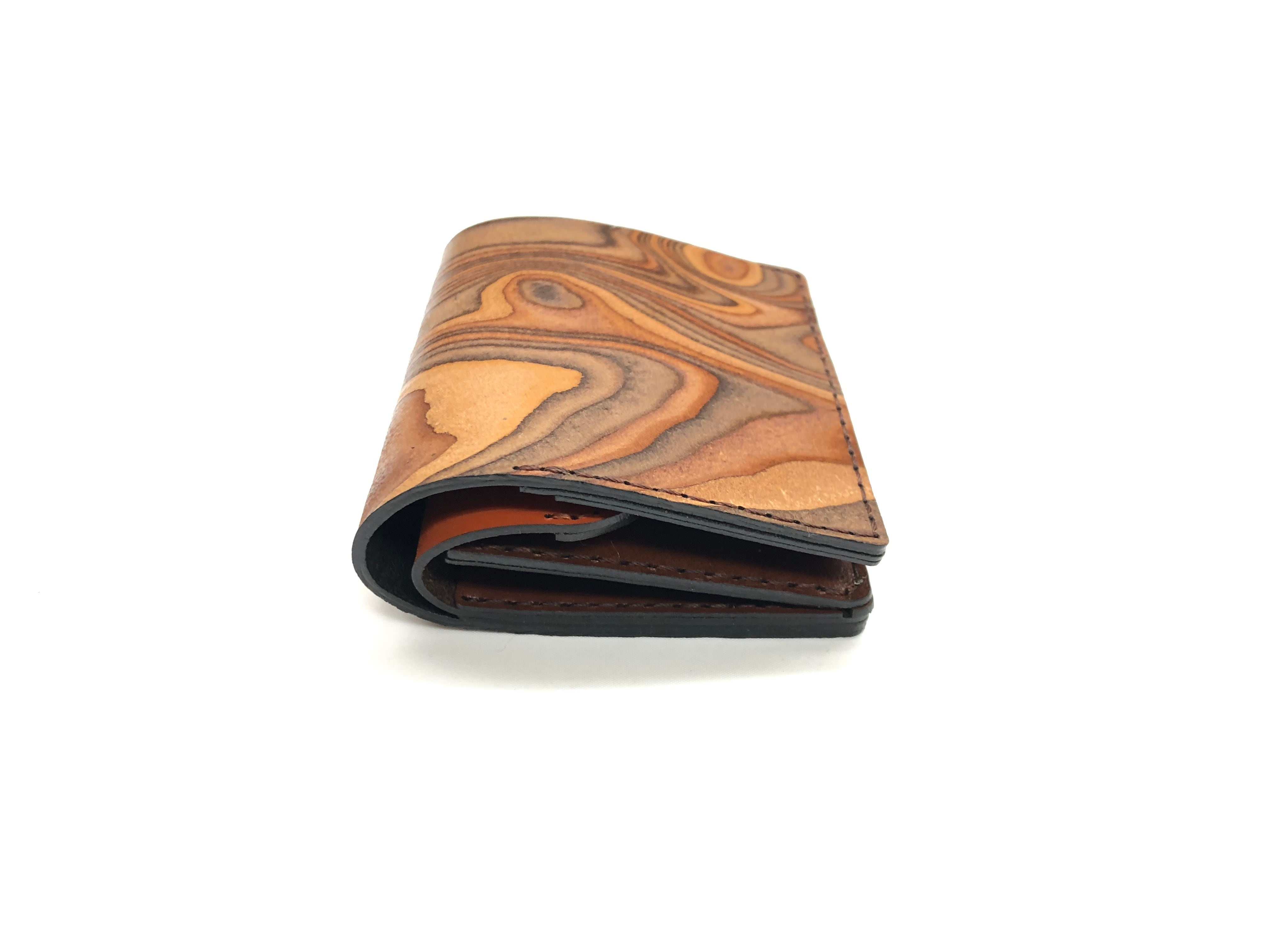 大久保氏が手掛ける、革を染色し、模様が出るように特殊な型押しをした何重枚何百枚の革を重ねて、漉き上げ木目やサイケデリックな模様作り出す、世界に1つのスペシャルなレザーになります。