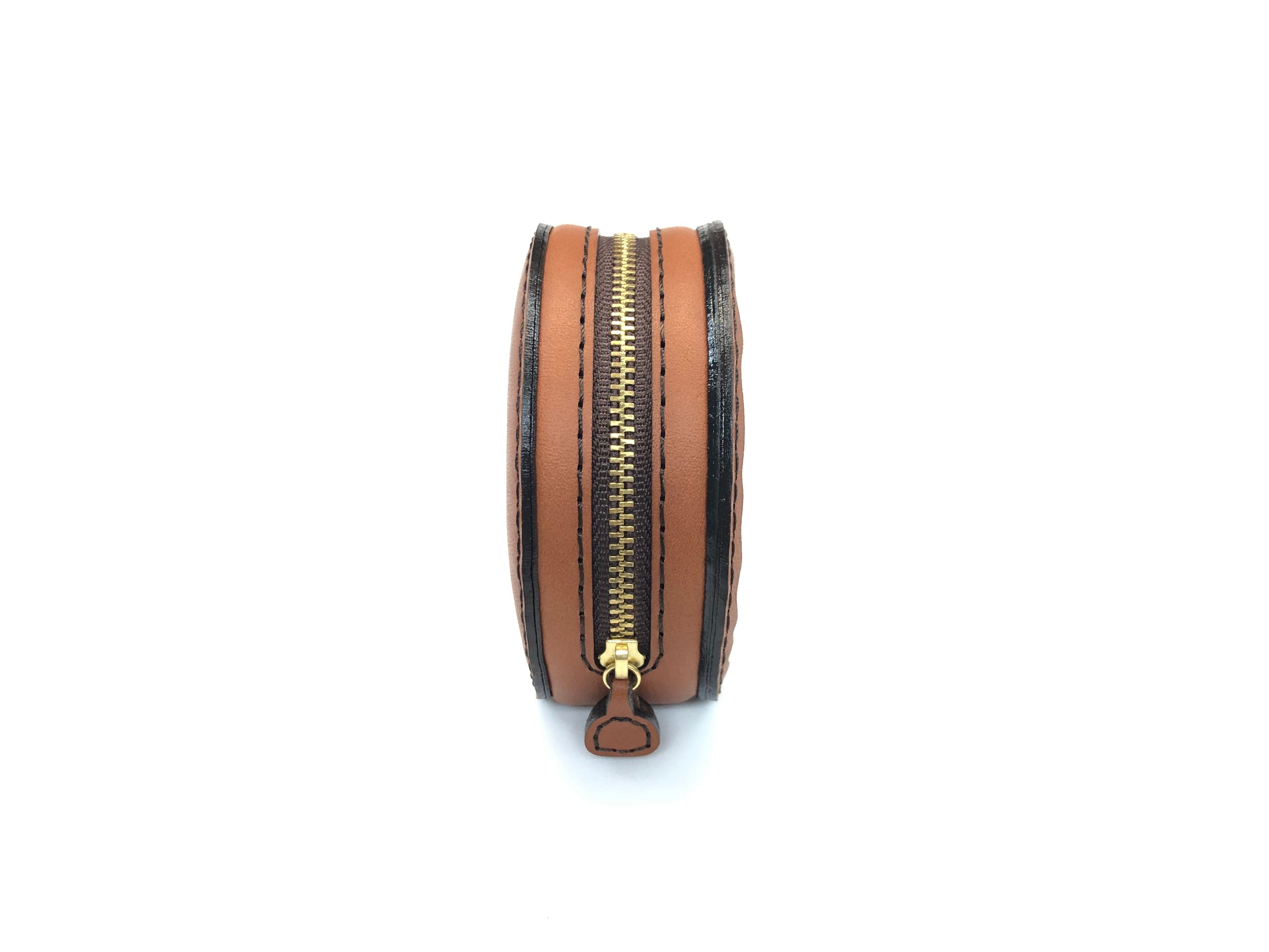 タンニン鞣しの姫路レザー牛ヌメ革と世界に1つのスキモレザーを使用した手染め、手縫いで仕上げた切り株モチーフのコインポーチになります。